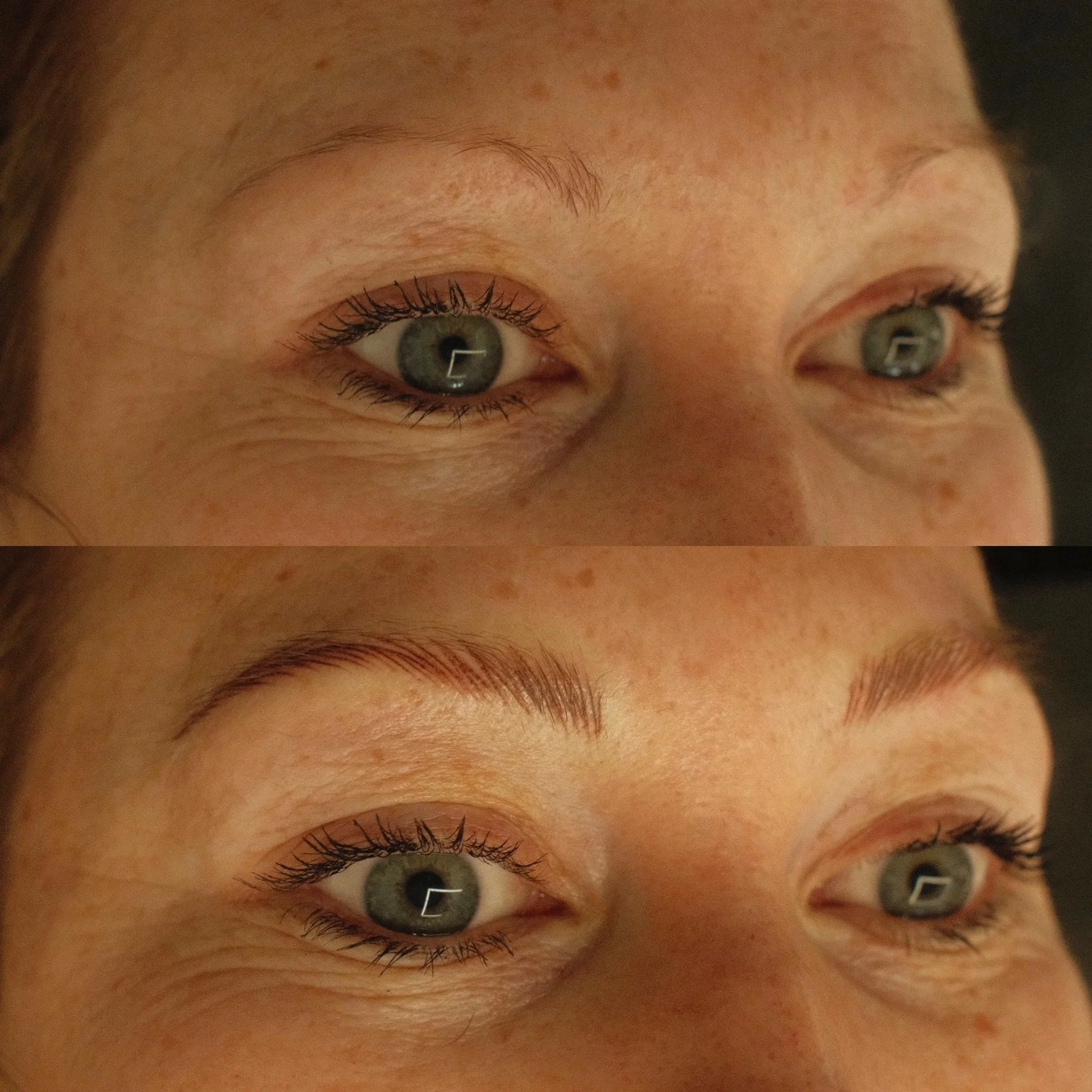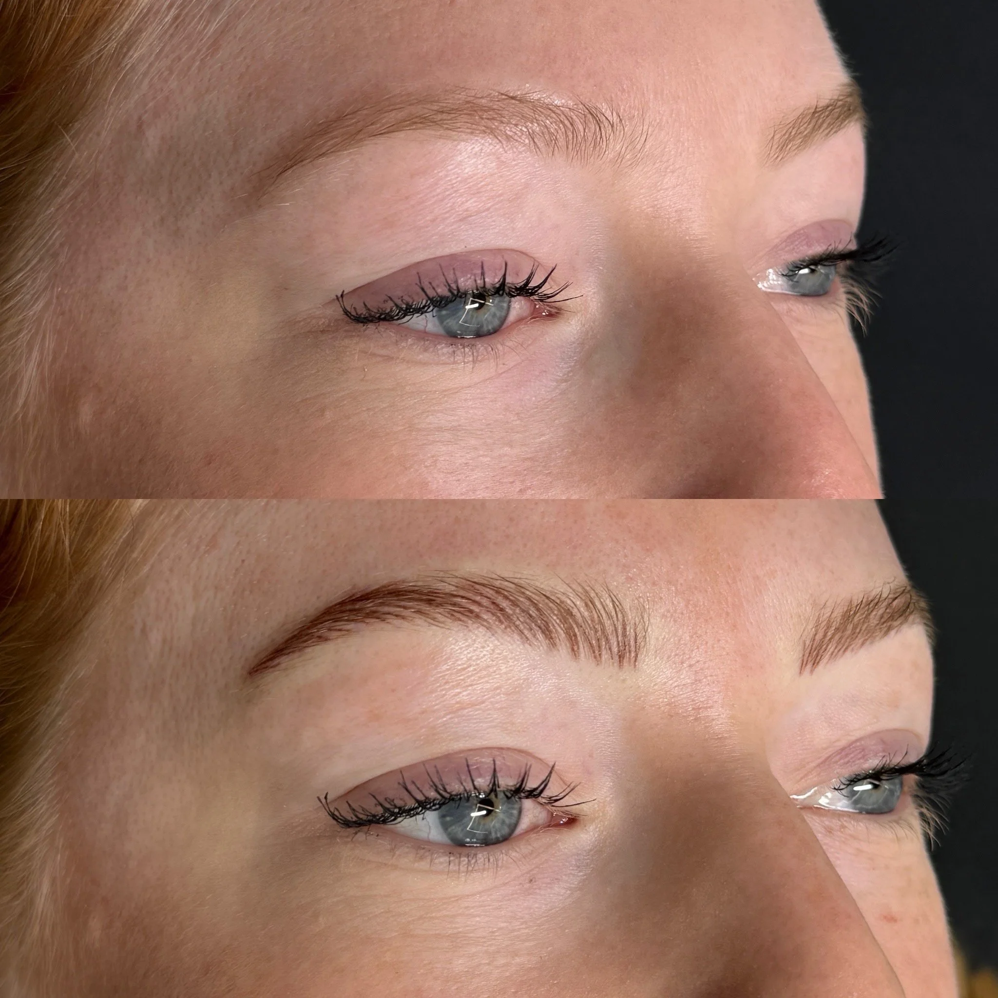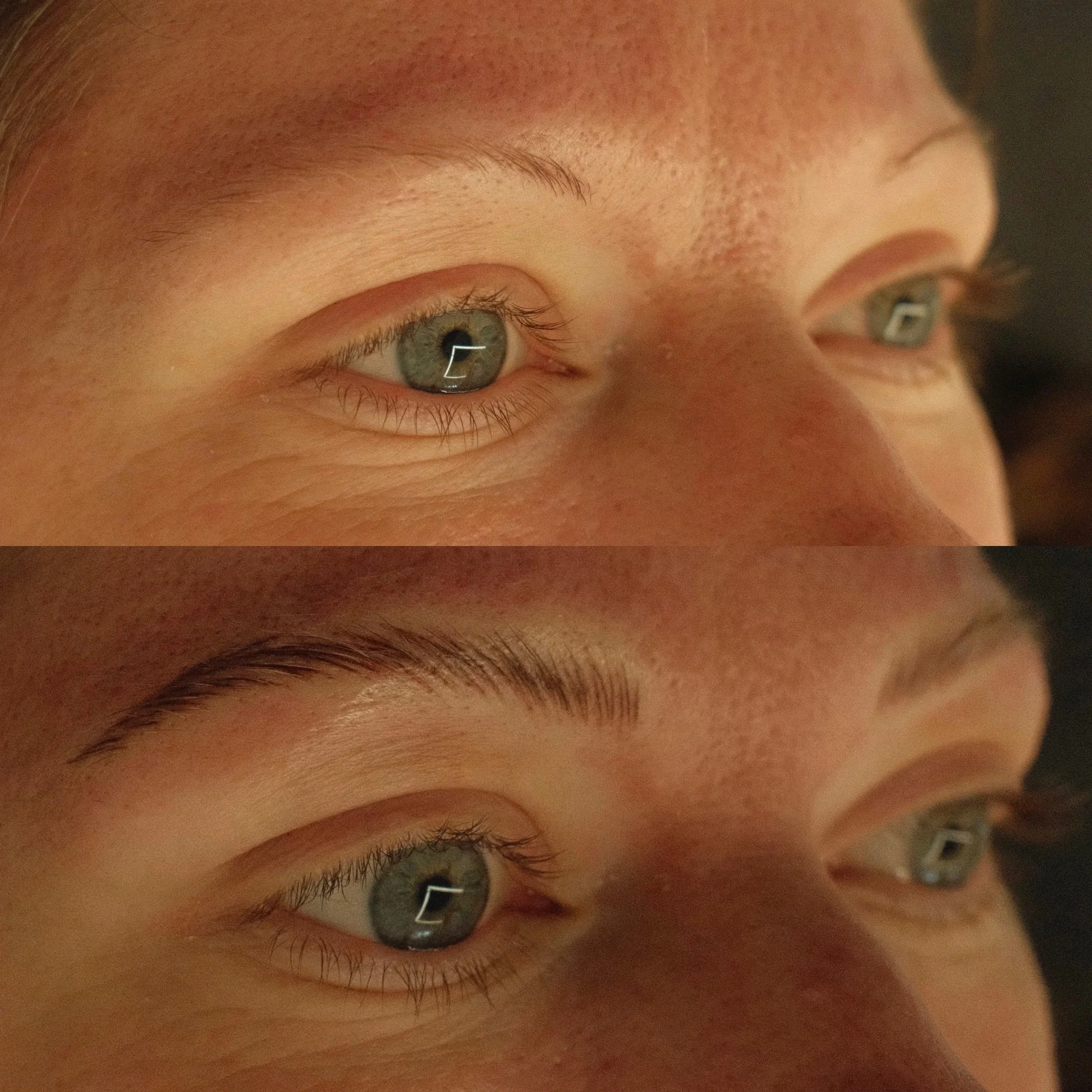 Die Brauen wirken zunächst kräftiger. Nach ca. 6–8 Wochen wird die Farbe feiner und natürlicher. Leichte Rötungen oder Schwellungen sind möglich und normal.